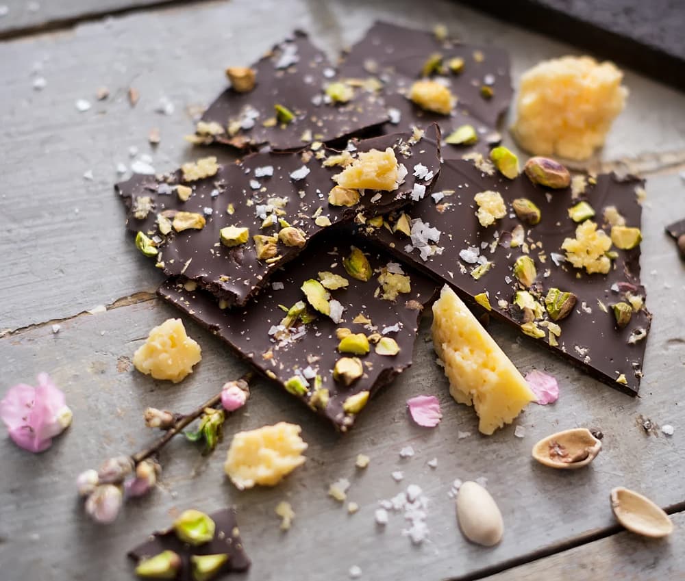 Bruten choklad med pistage och flingor av Västerbottensost