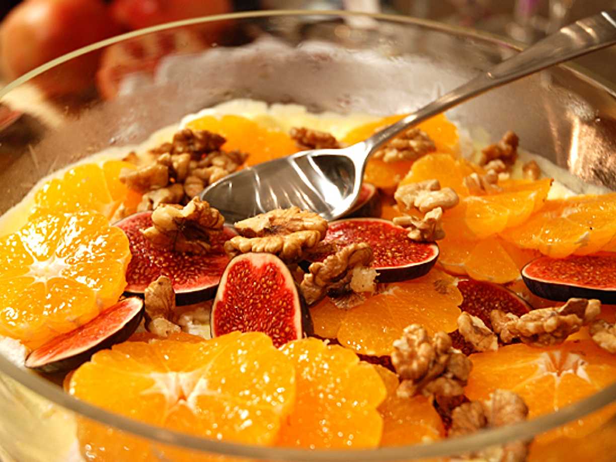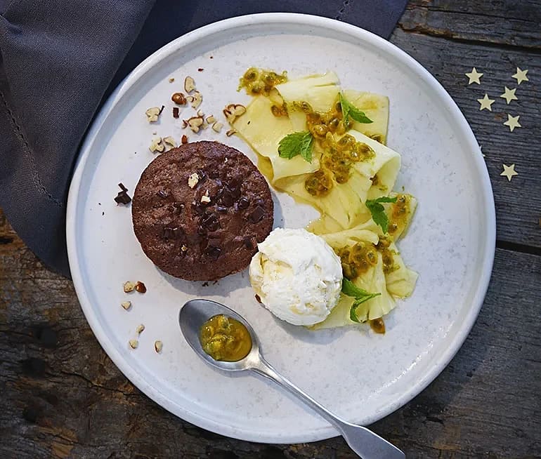 Choklad- och pecannötsbakelse med ananassallad