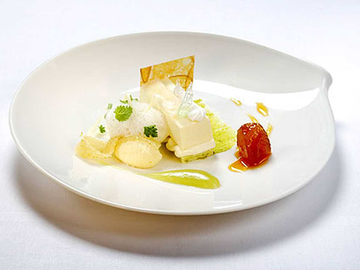 Äppelbavaroise med Calvados, Sorbet och äppelterinne , Vit choklad- och färskost”queneller” , Varma karamelläpplen och äppelpuré