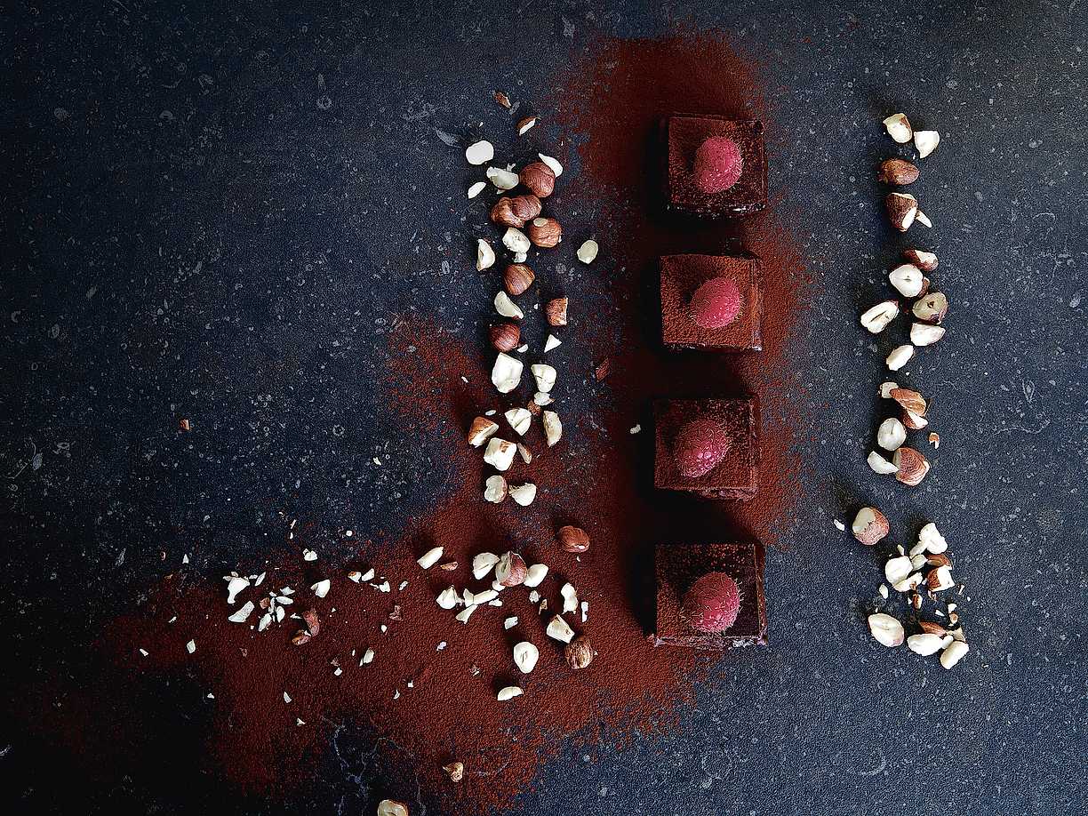 Choklad- och hasselnötsbrownie med hallonganache