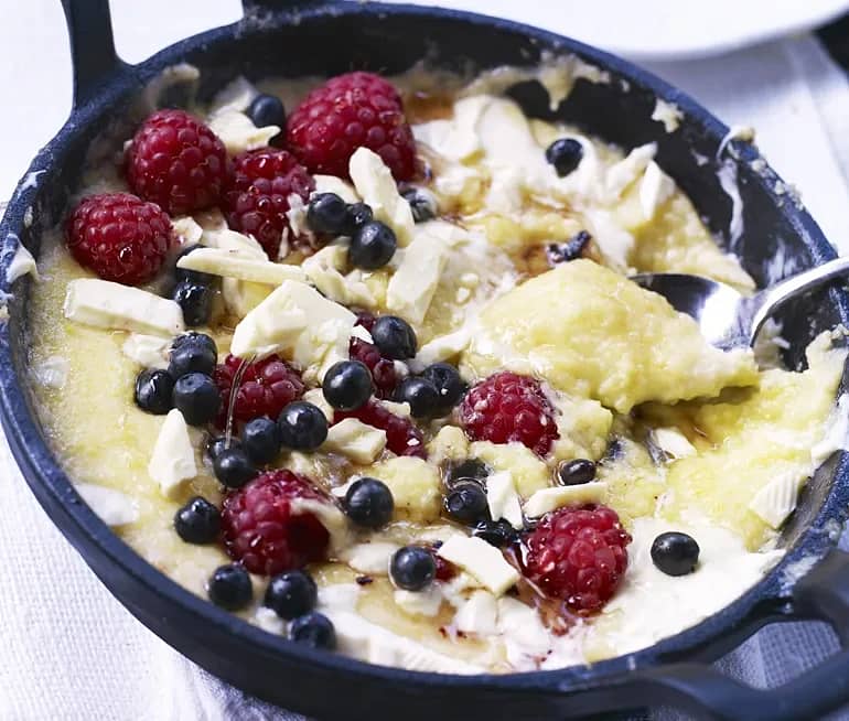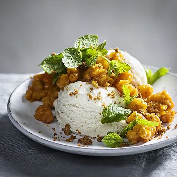 Vit choklad- och kokosgratinerad mango med limeyoghurt