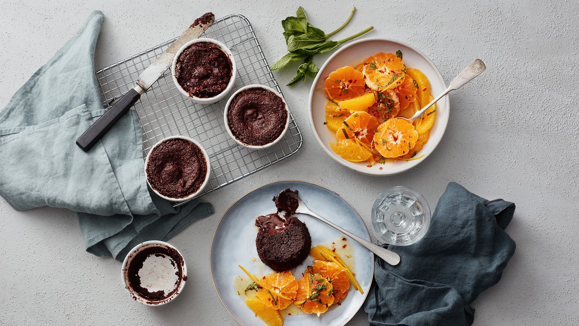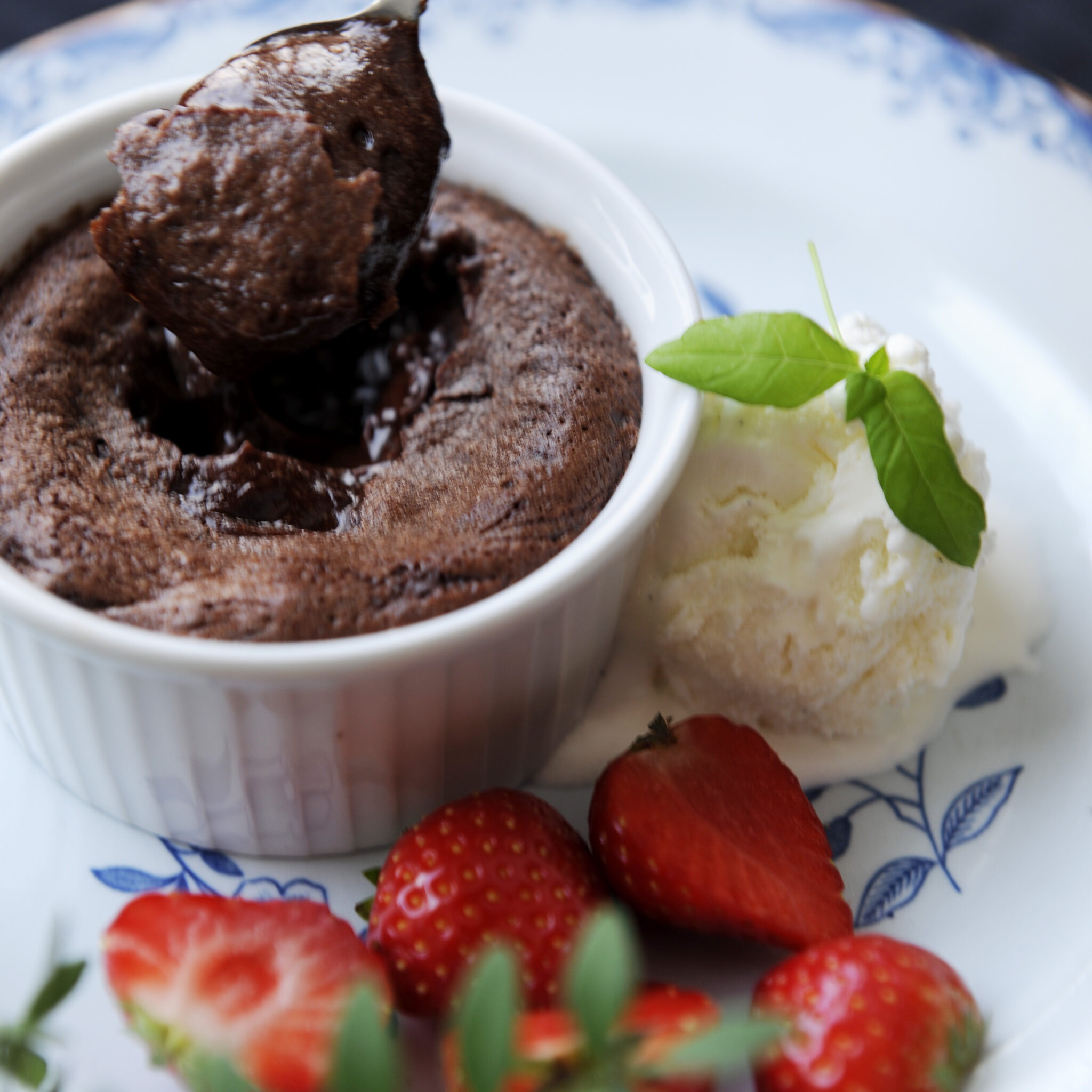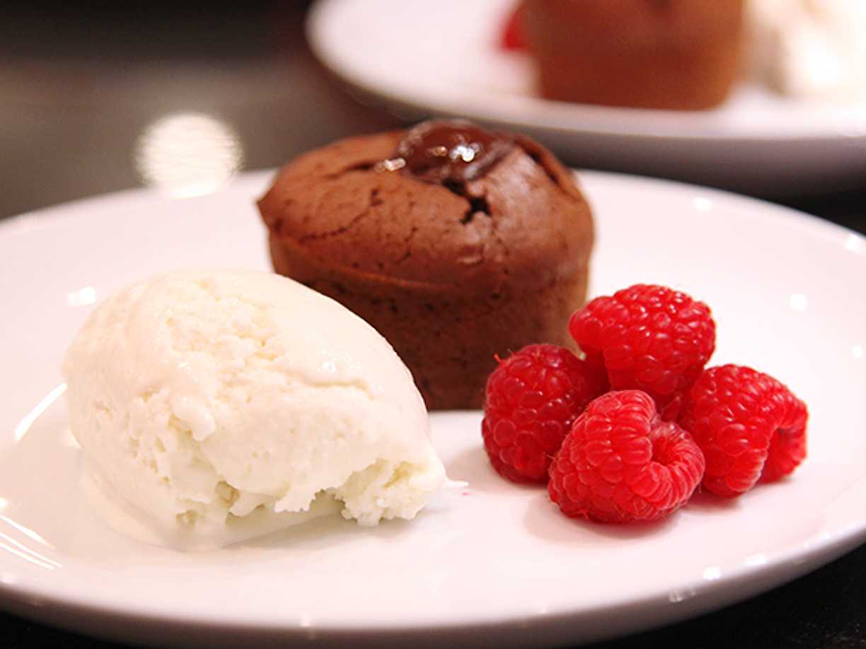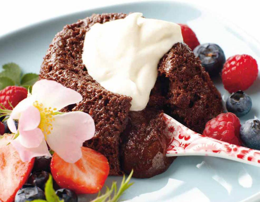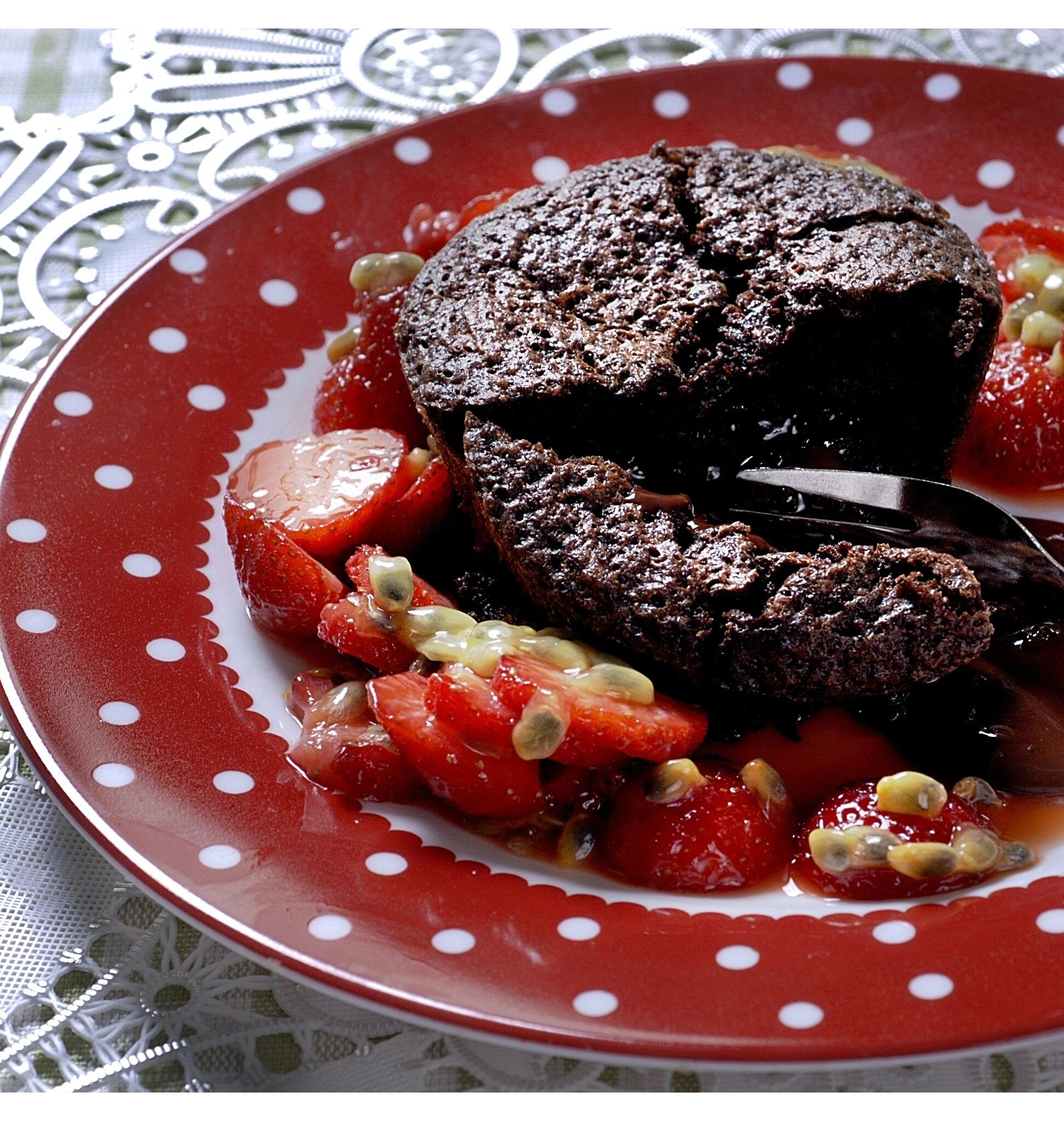 Chokladfondant med jordgubbs- och passionsfruktsallad