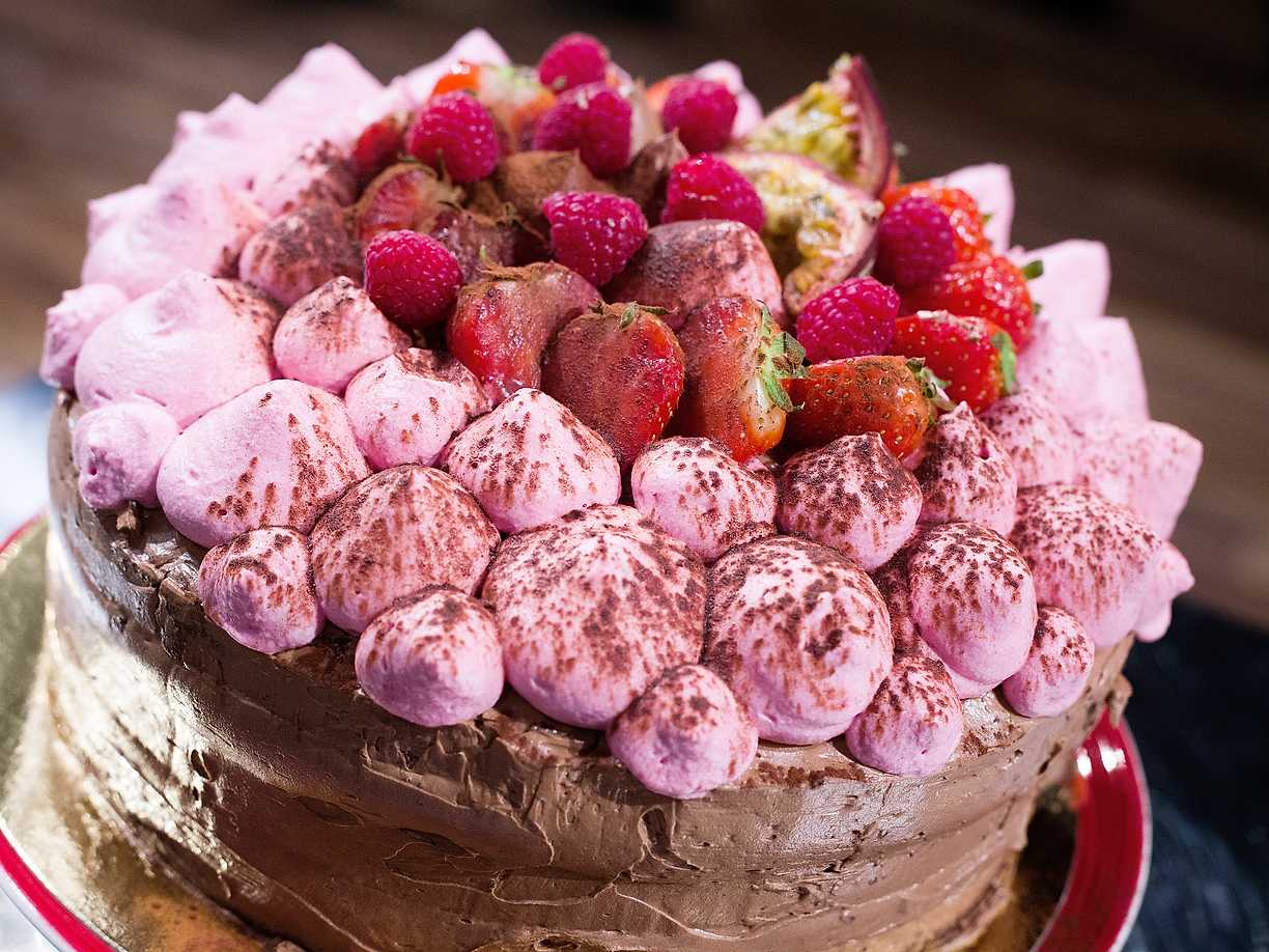 Chokladtårta med passionsfruktspannacotta, jordgubbsmousse och mörk chokladsmörkräm