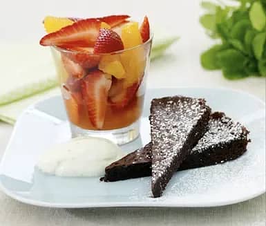Citrusmarinerade jordgubbar med honungsyoghurt och chokladtårta