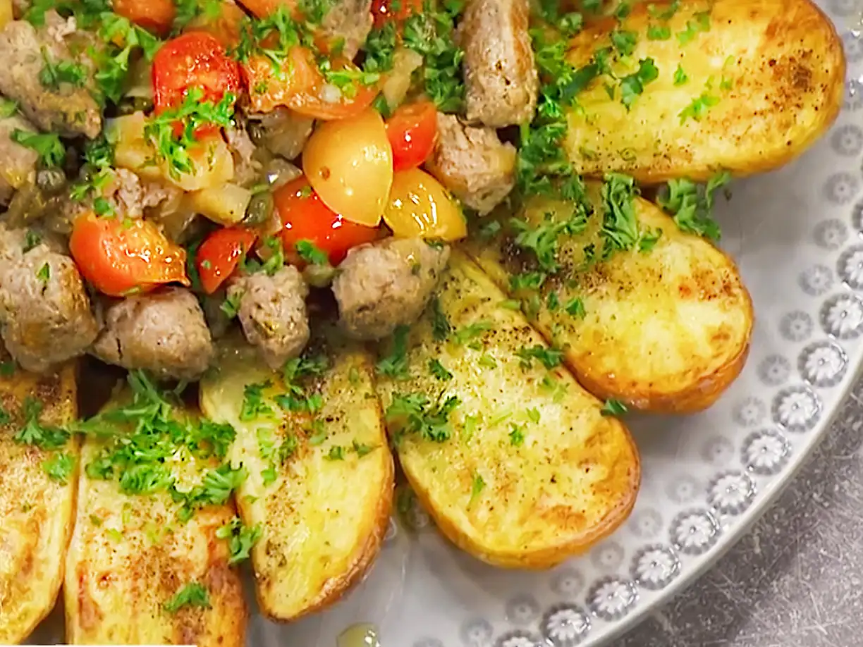 Stekt lax med pressad potatis, gräddfil, citron och örter