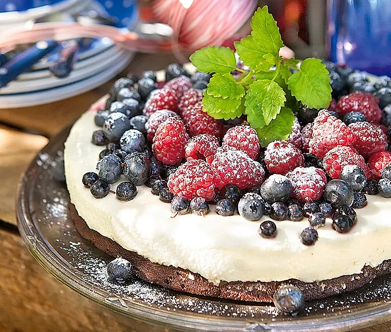 Lakritsbrownie med citronmousse och bär