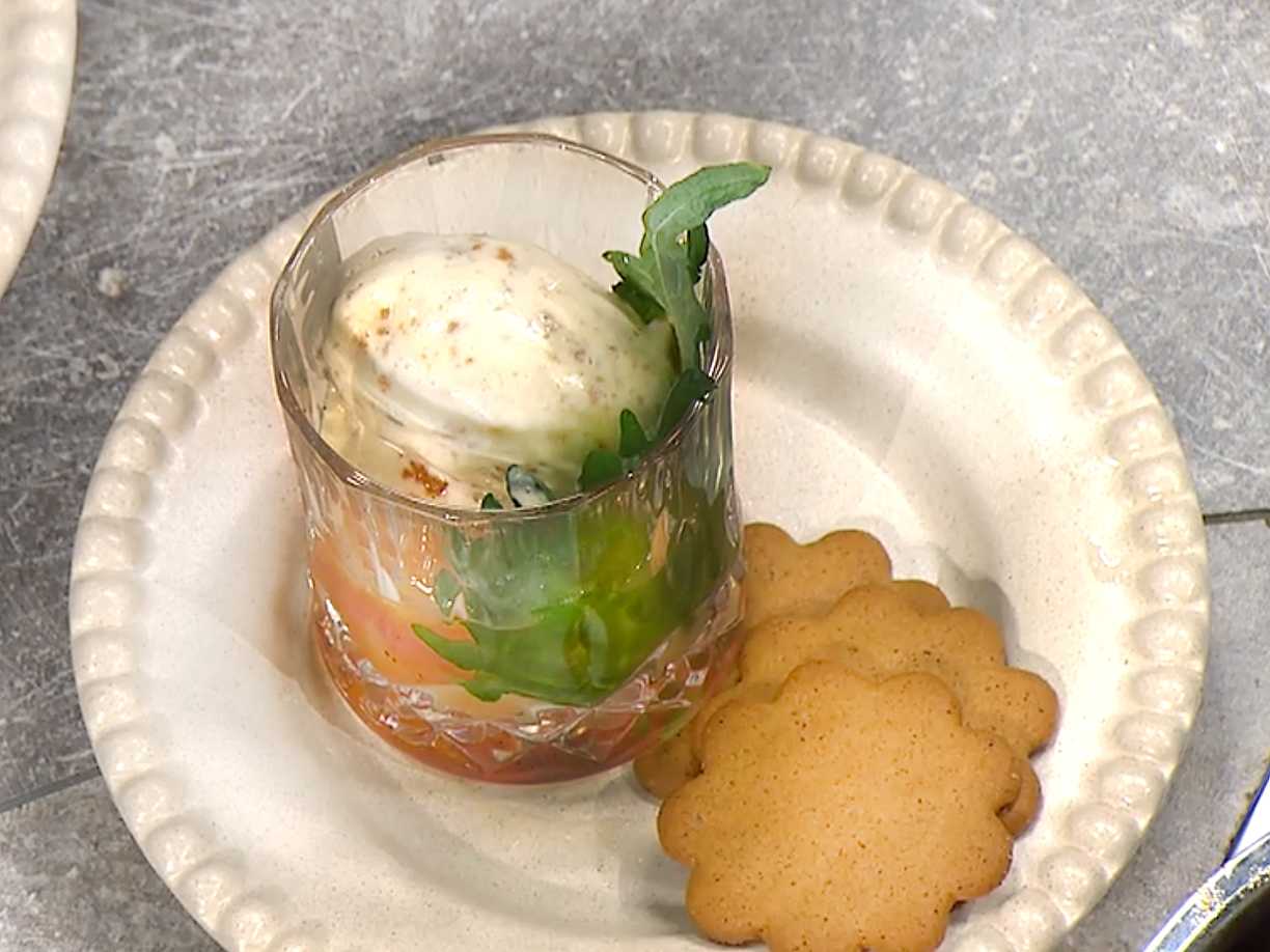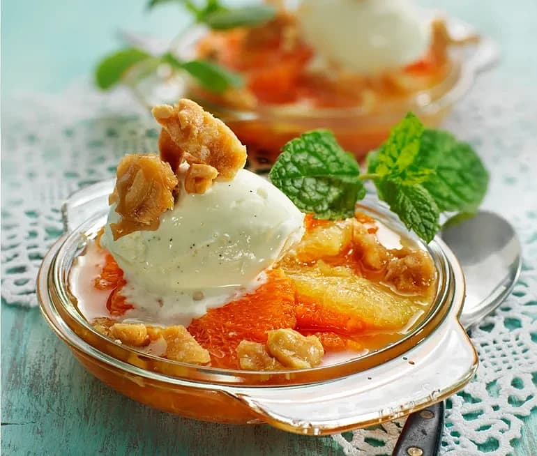 Citrus- och ingefärsmarinerad frukt med kokosglass