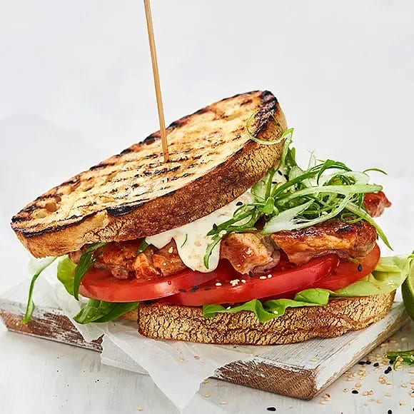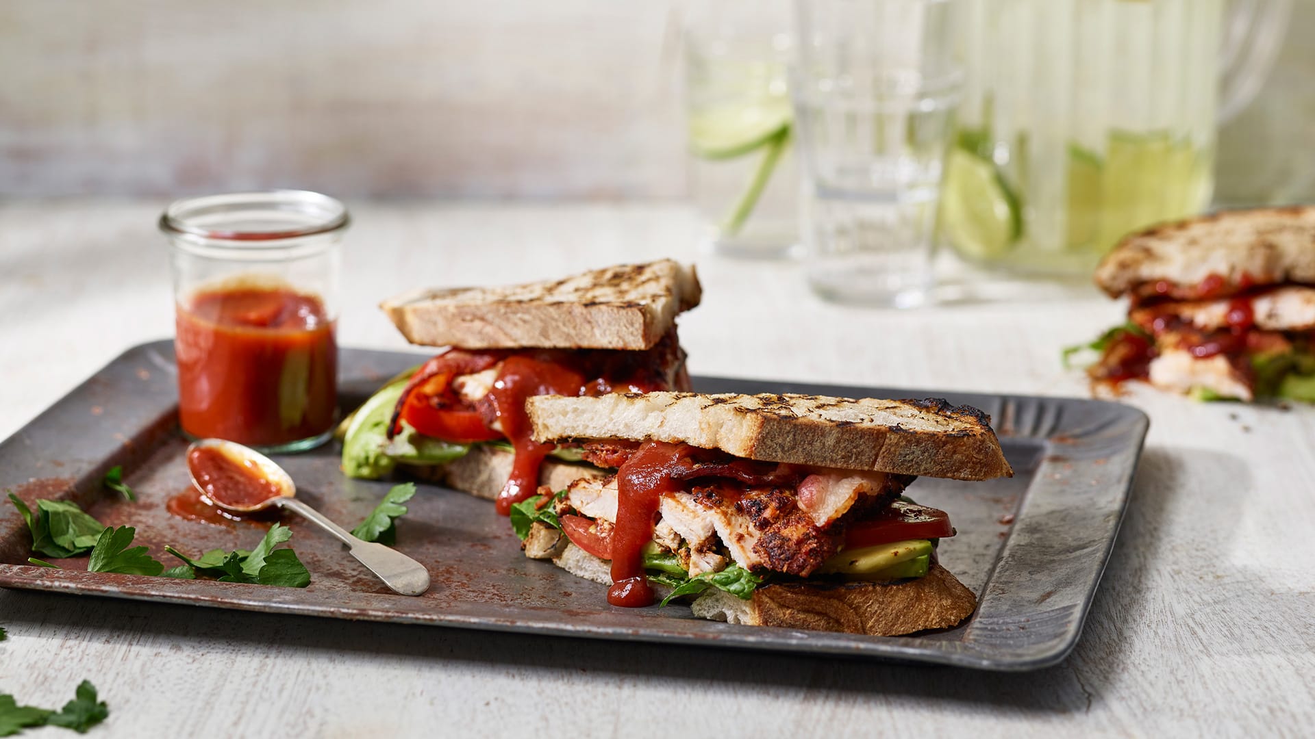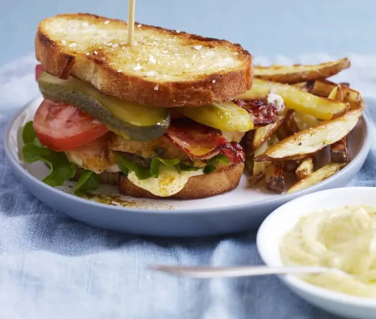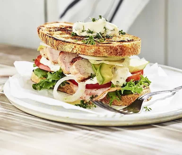 Club sandwich med kyckling, avokado, bacon och ädelost