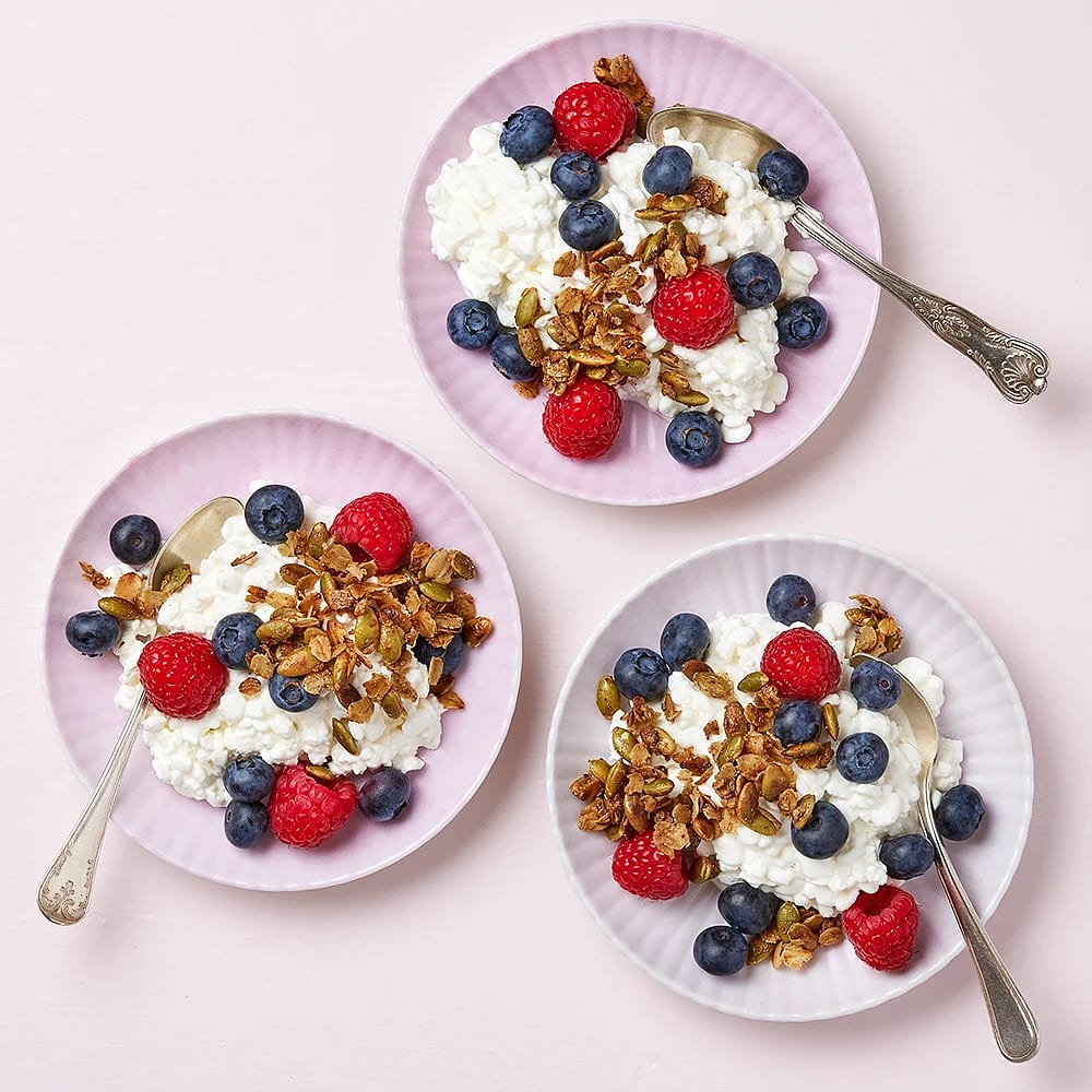 Cottage cheese med färska bär och kardemummastekta pumpakärnor