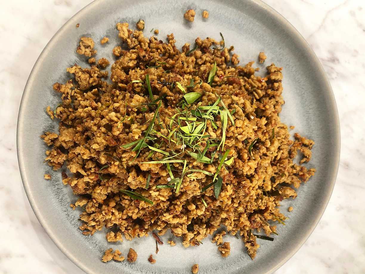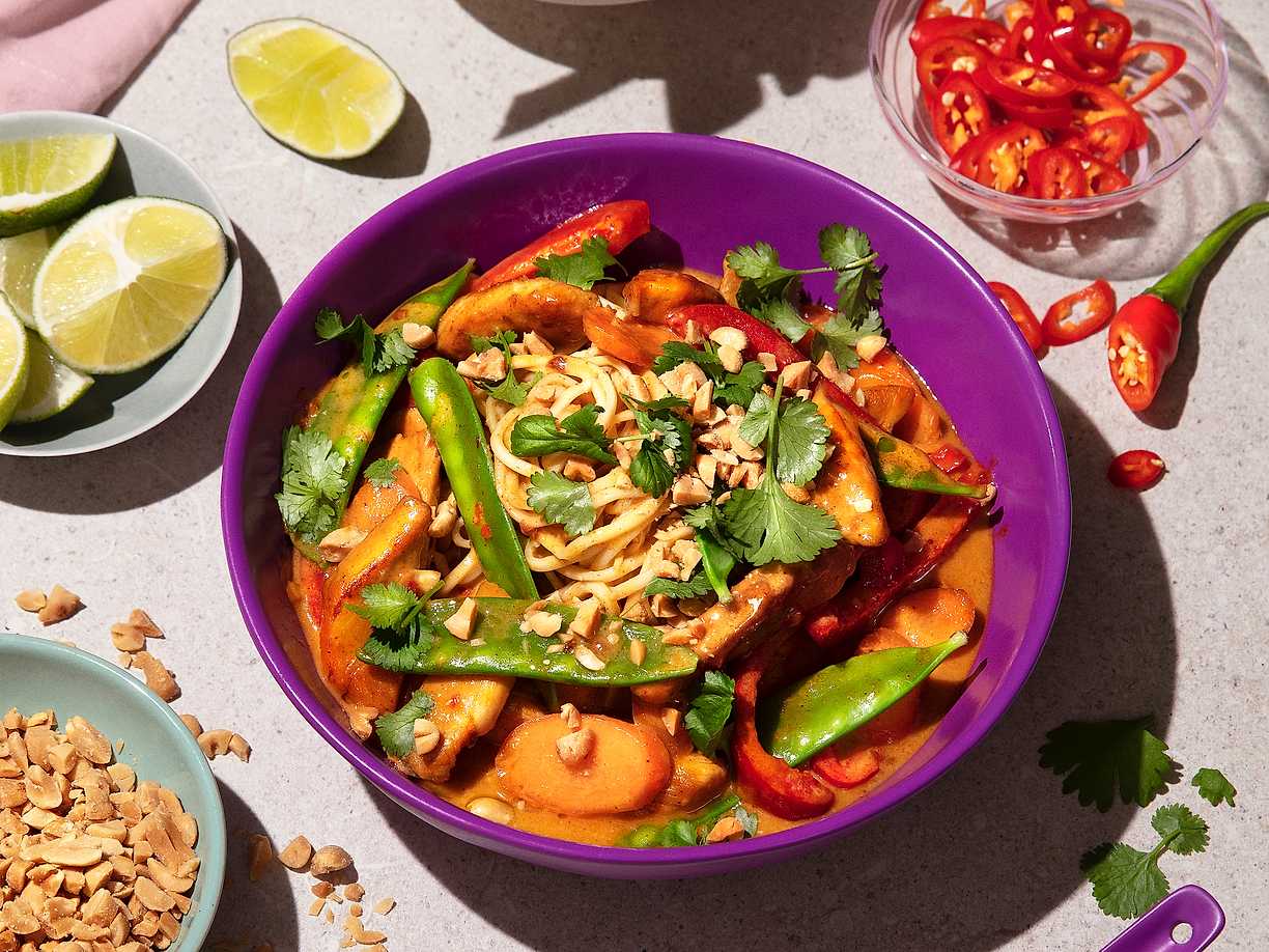 Kycklingpaj med röd curry och pak soi och jordnötter