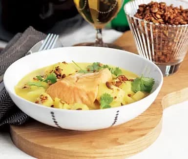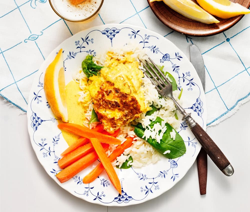 Fiskgratäng med curry, räkor och spritsat potatismos