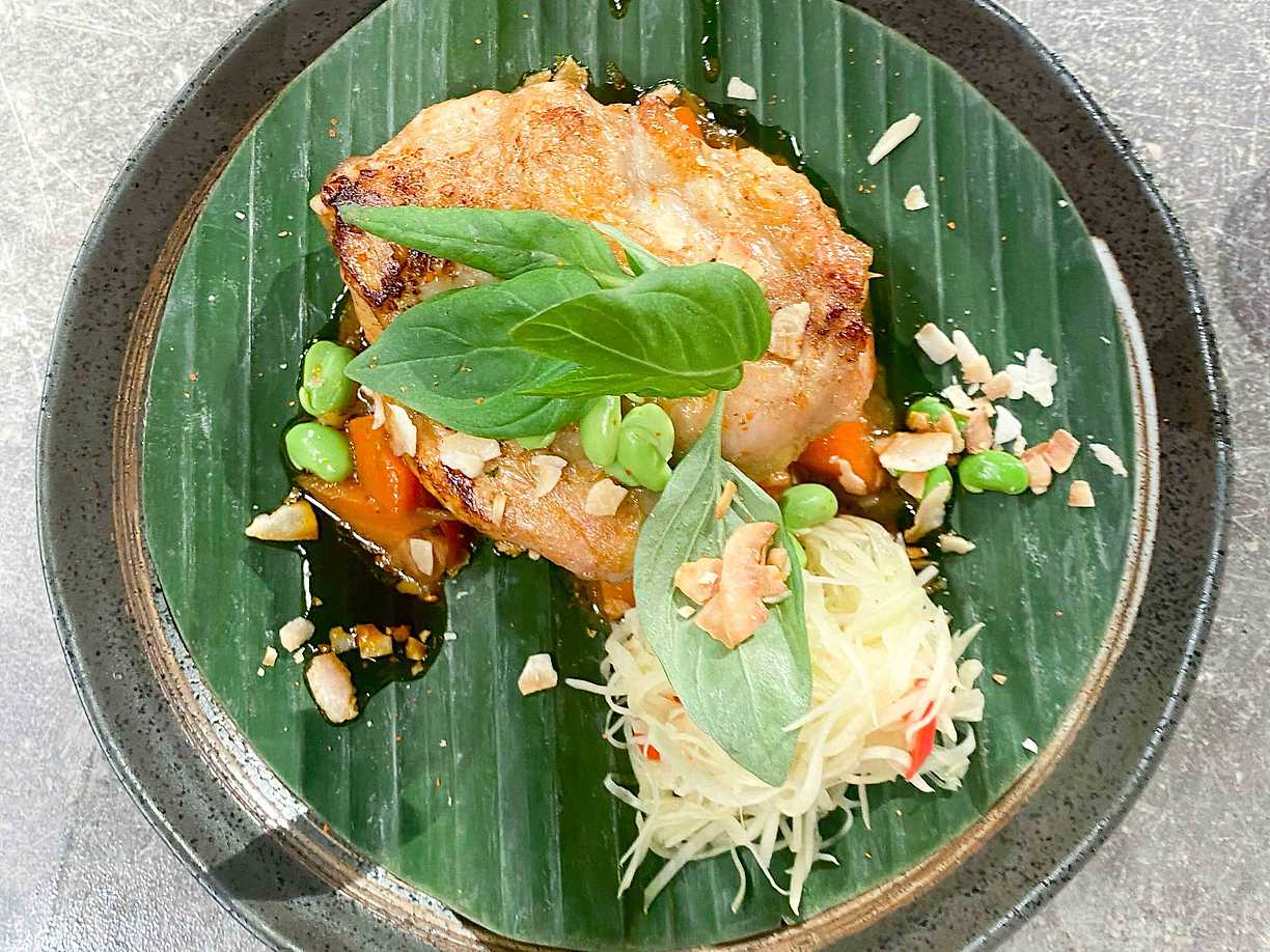 Rostad zucchini och aubergine med grön curry och jordnötter