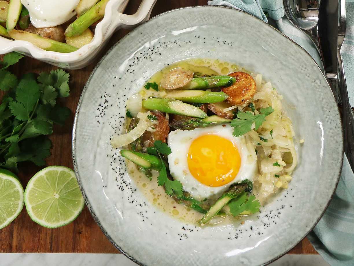 Grön currygryta med sparris och sesamägg