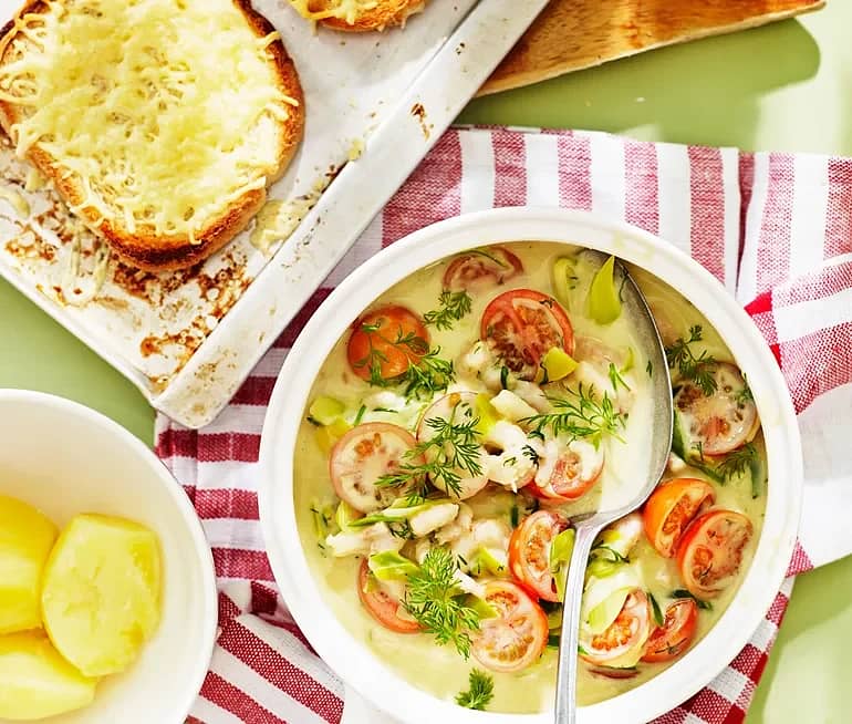 Fisk- och skaldjursfrikassé med dill- och vitvinssås