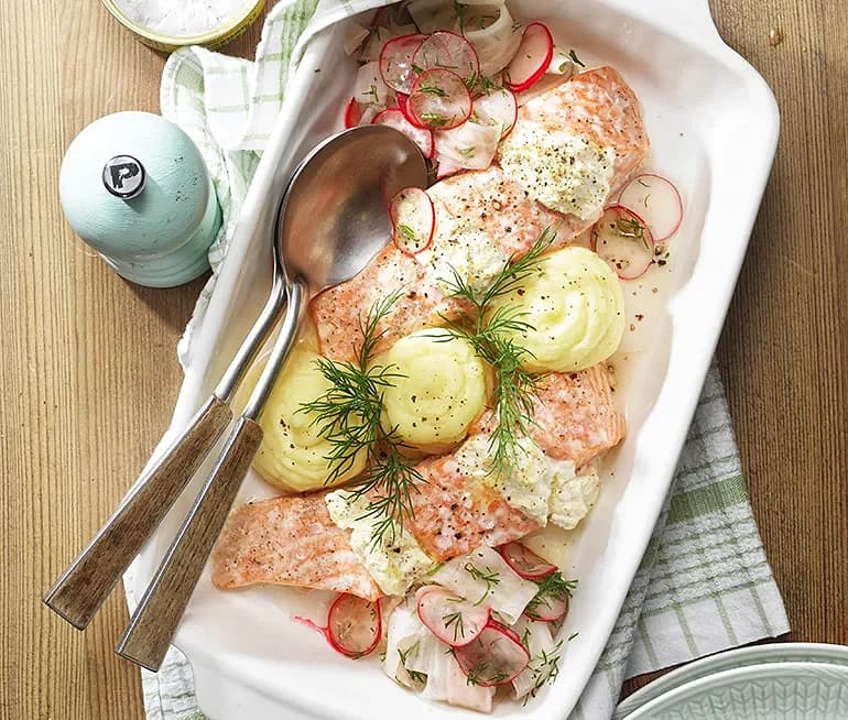 Ugnsbakad sej med palsternacksmos samt äpple och ärter i dill