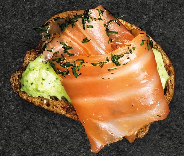 Crostini med lenrimmad laxros och dillyoghurt