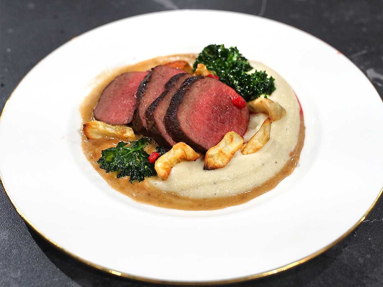Ryggbiff av dovhjort med råstekt potatis och rödvinssås