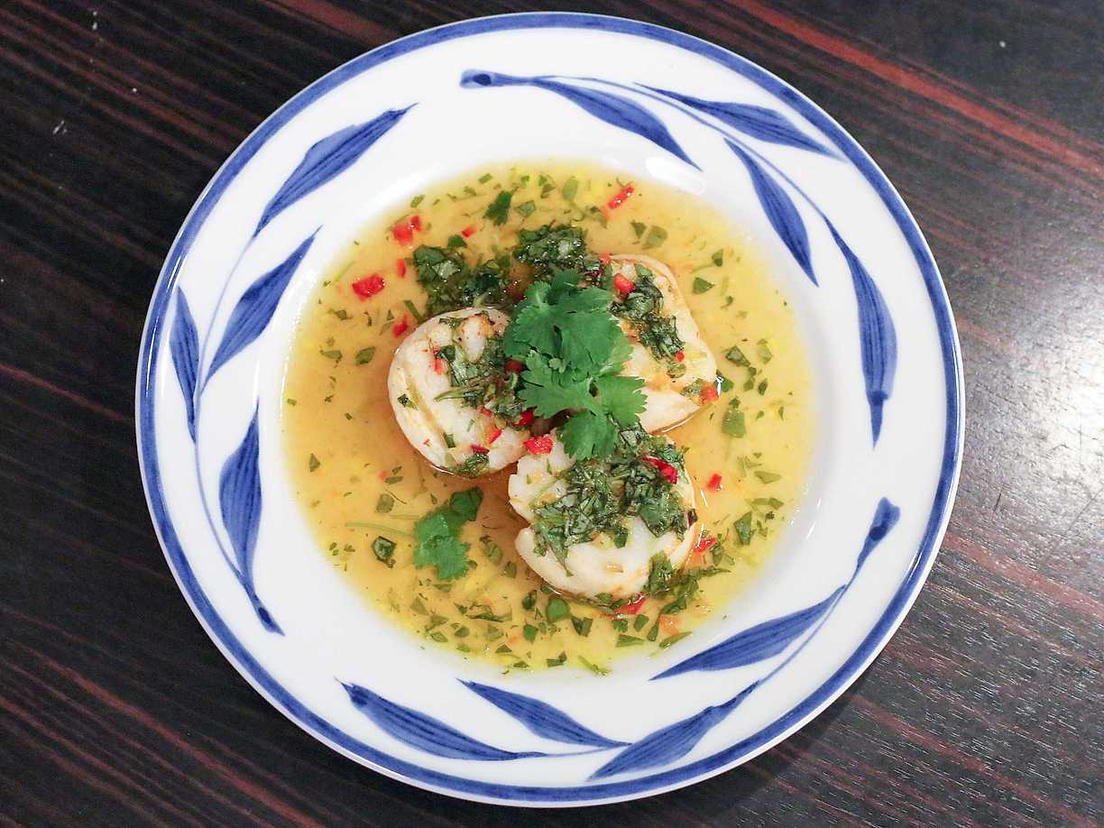 Halstrade pilgrimsmusslor med dressing