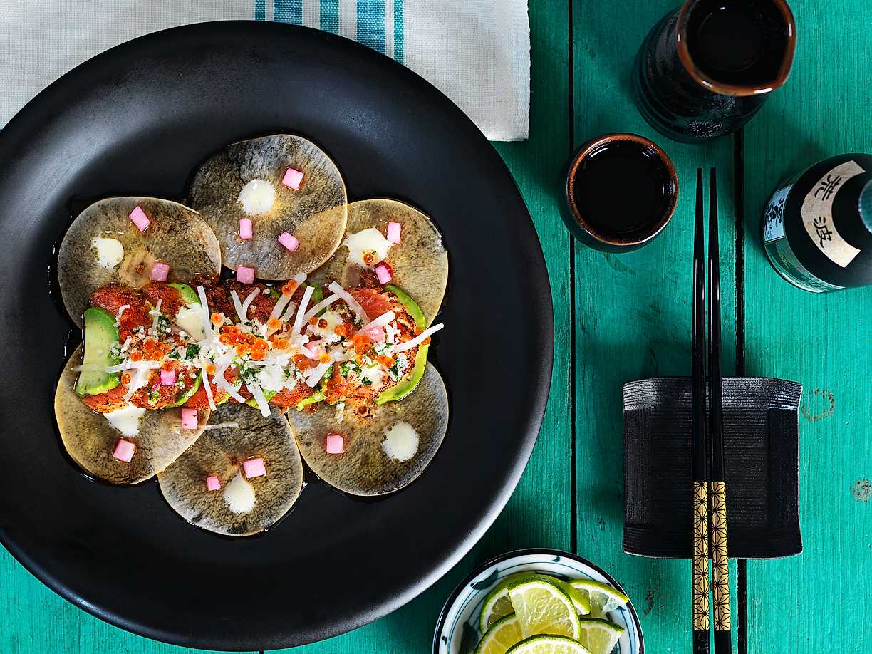 Tatakilax med nashipäron, picklad rättika, japansk dressing och yuzumajonnäs