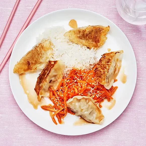 Dumplings med morotssallad och ris