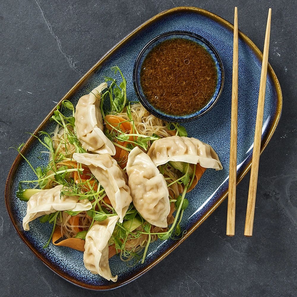 Vegetariska dumplings med limemarinerade böngroddar