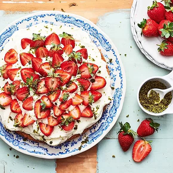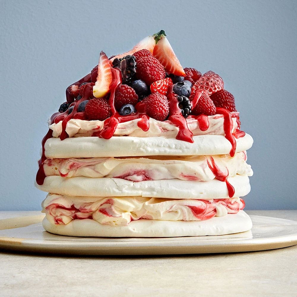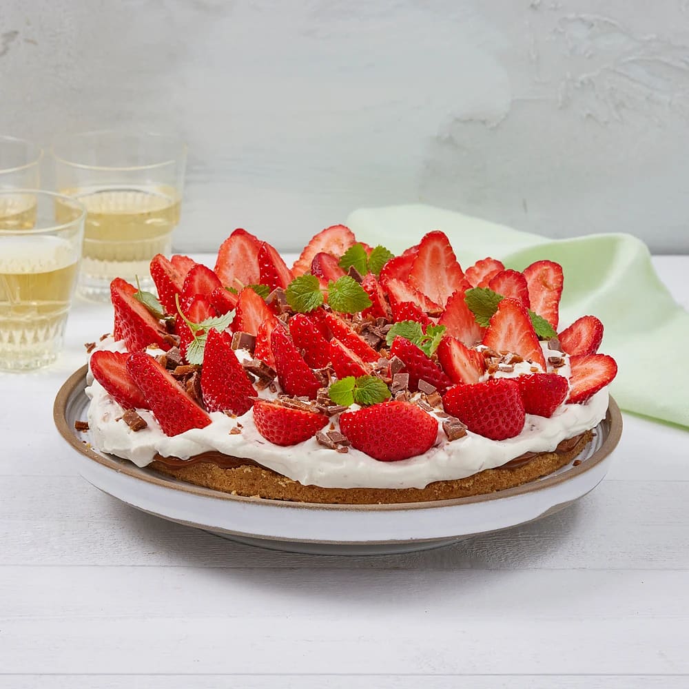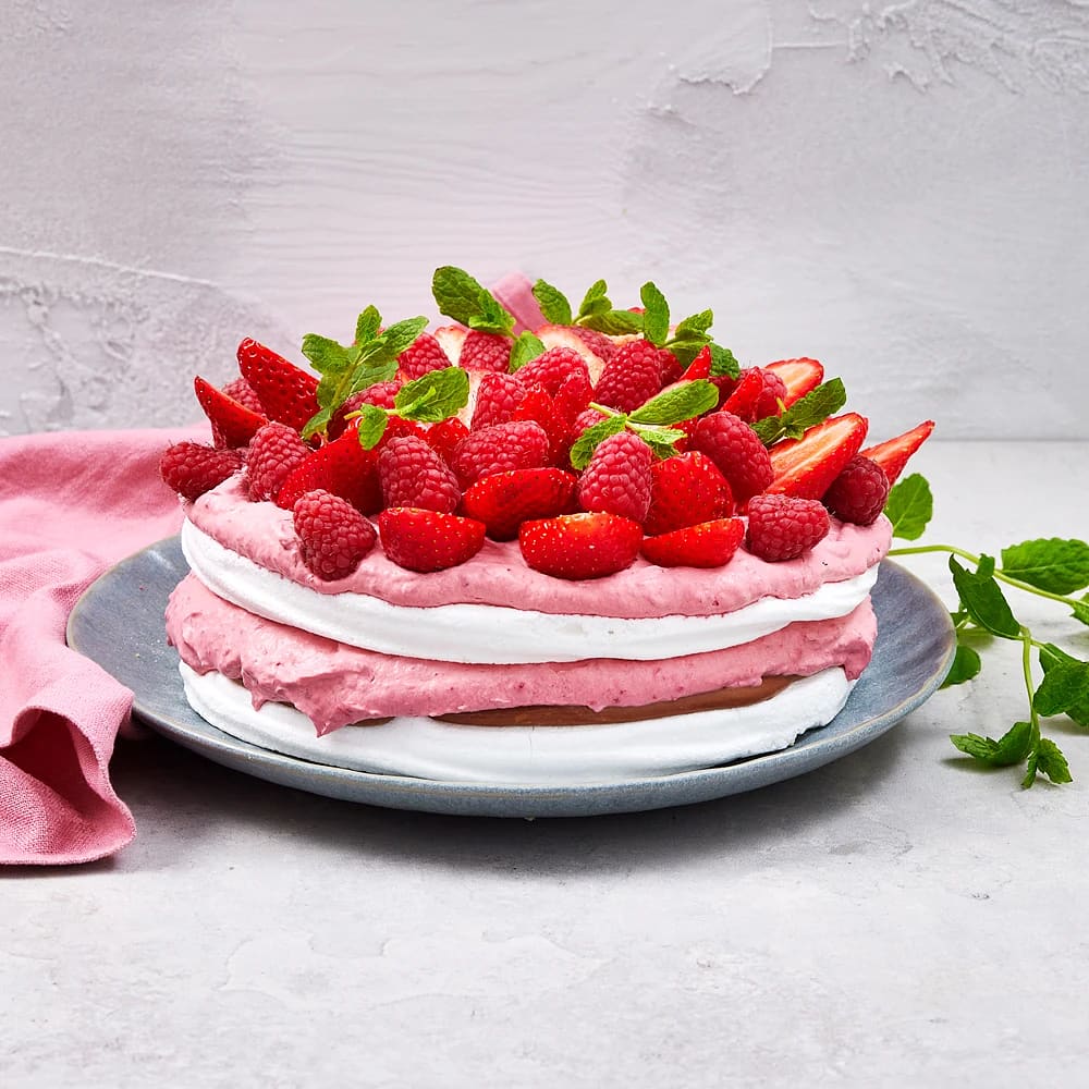 Marängtårta med mjölkchokladtryffel, hallongrädde och färska jordgubbar