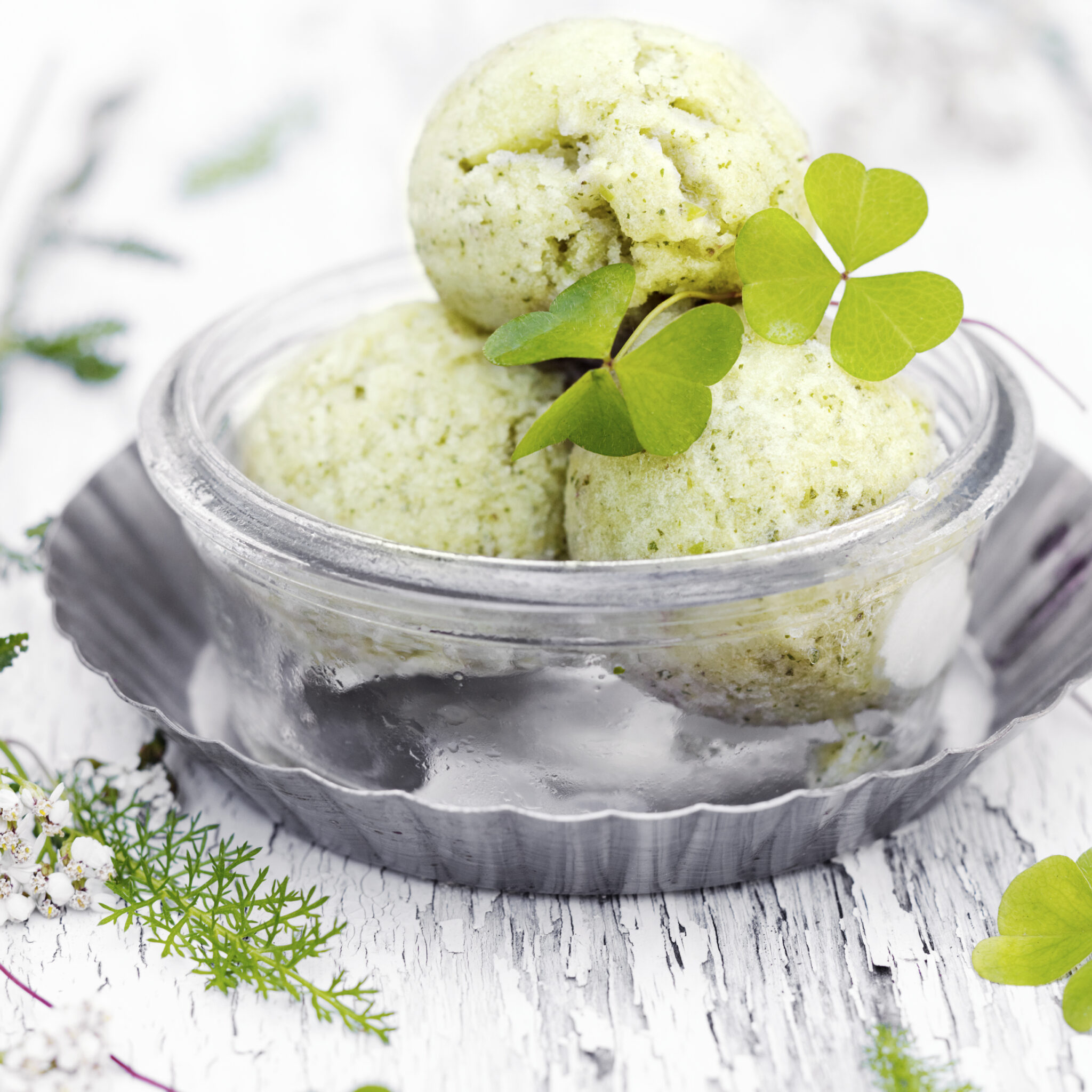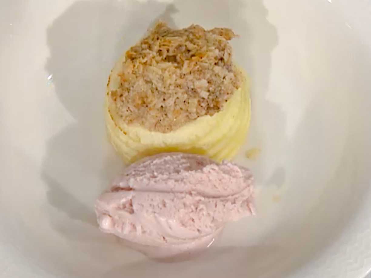 Äpplesorbet med vit chokladcremeux och krispigt bovete