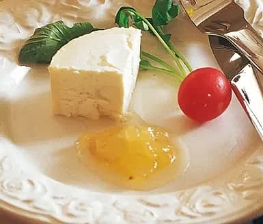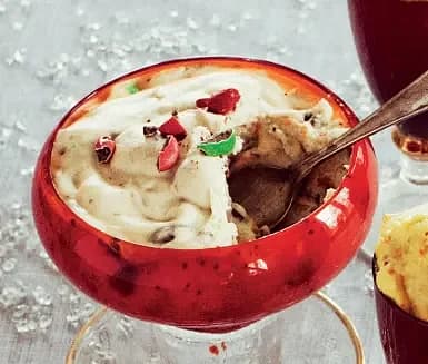 Vit chokladmousse i kopp med hallonmylta och rosenblad