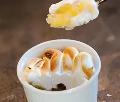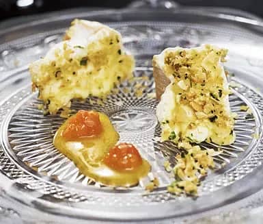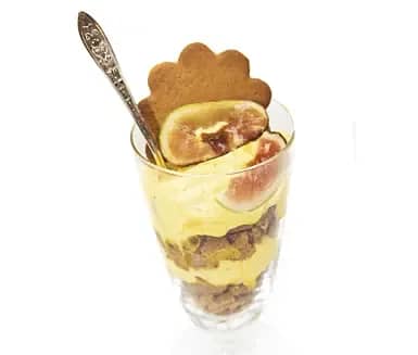 Crème brûlée med kaffesmak, rabarber-is och bär