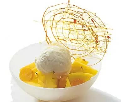 Apelsincrêpes med mandeltäcke och vaniljglass