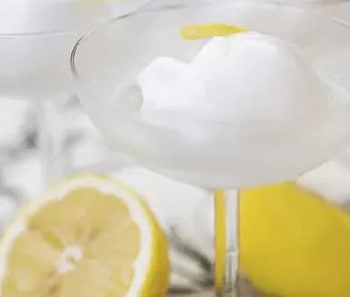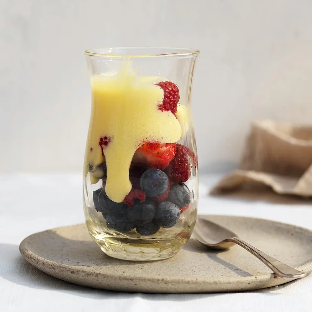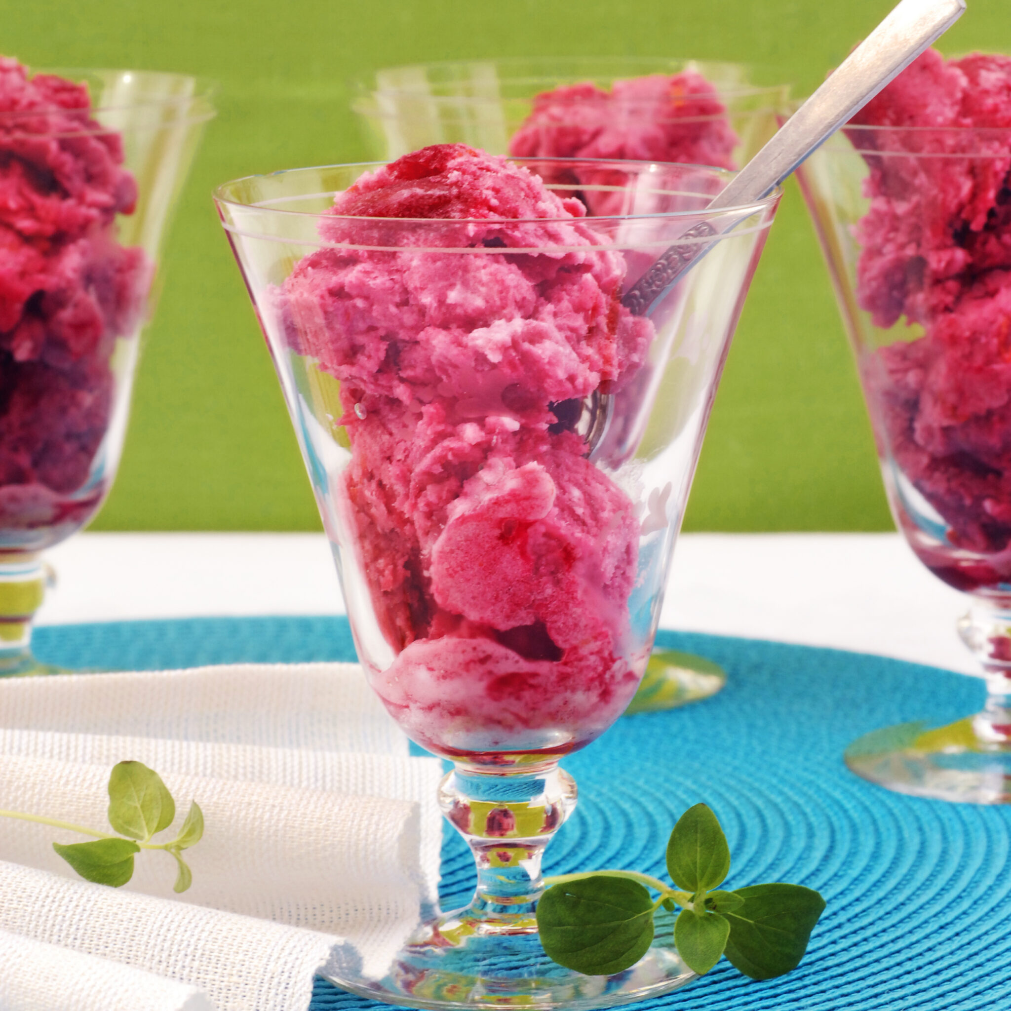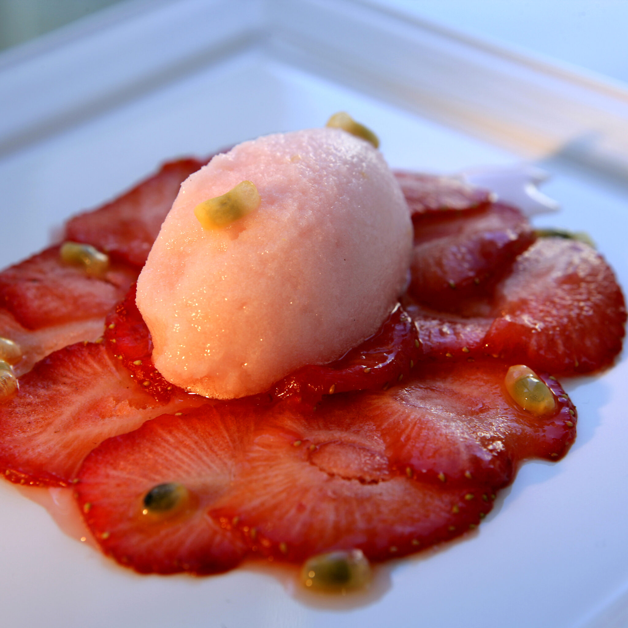 Rabarbersorbet serverad på jordgubbscarpaccio