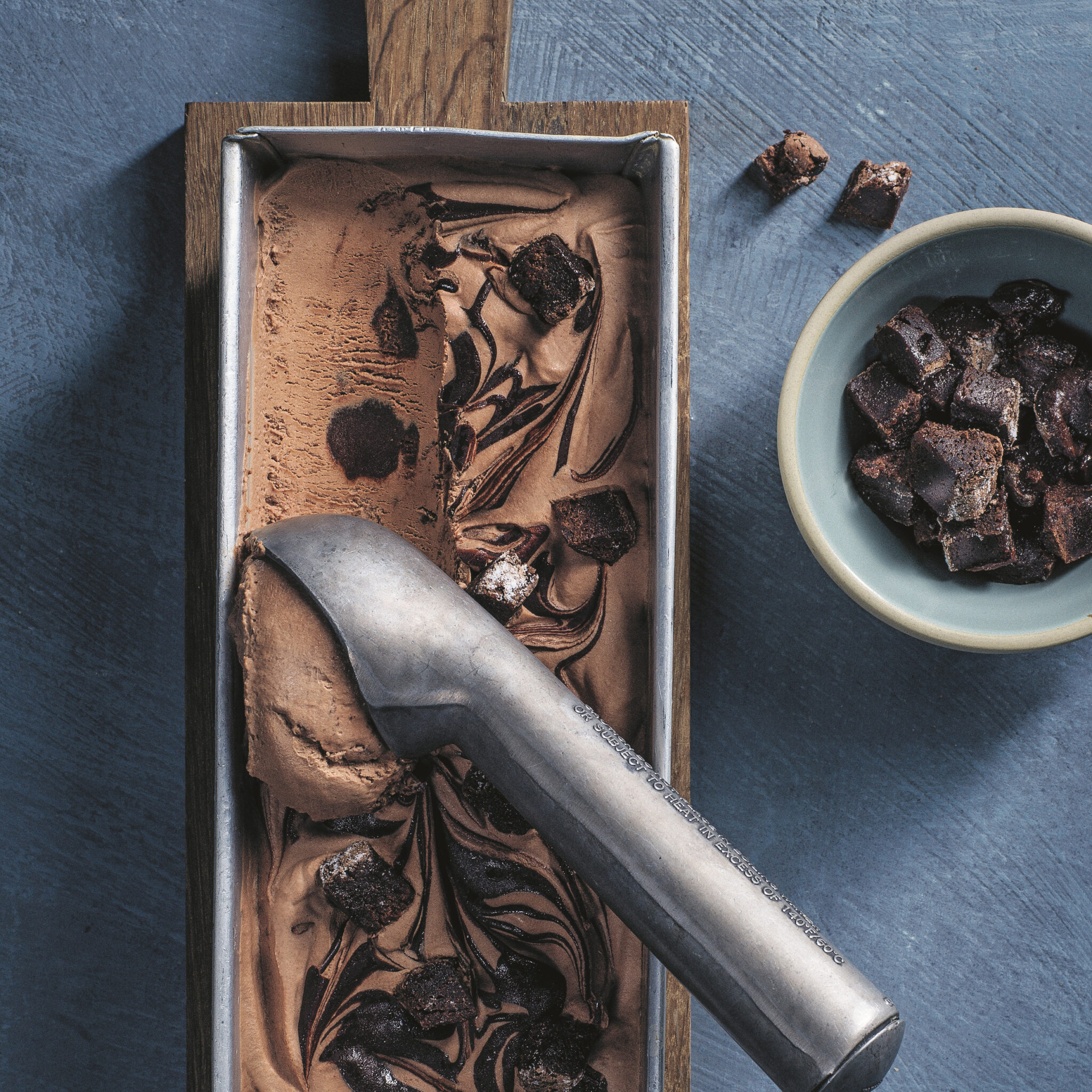 Mörk chokladbrownie med rom, mynta och matchachokladbark