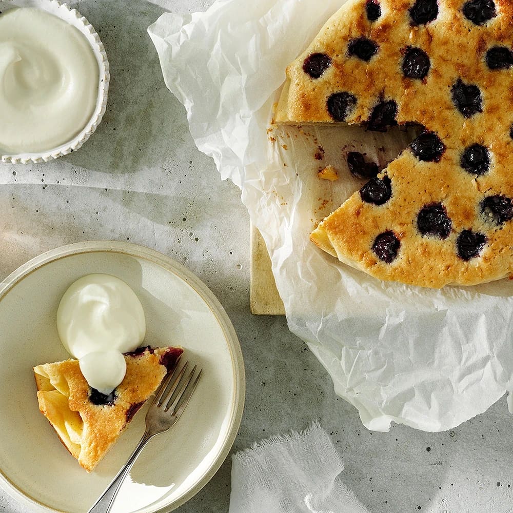 Saffranskaka med vispad pannacotta och salmbärssorbet