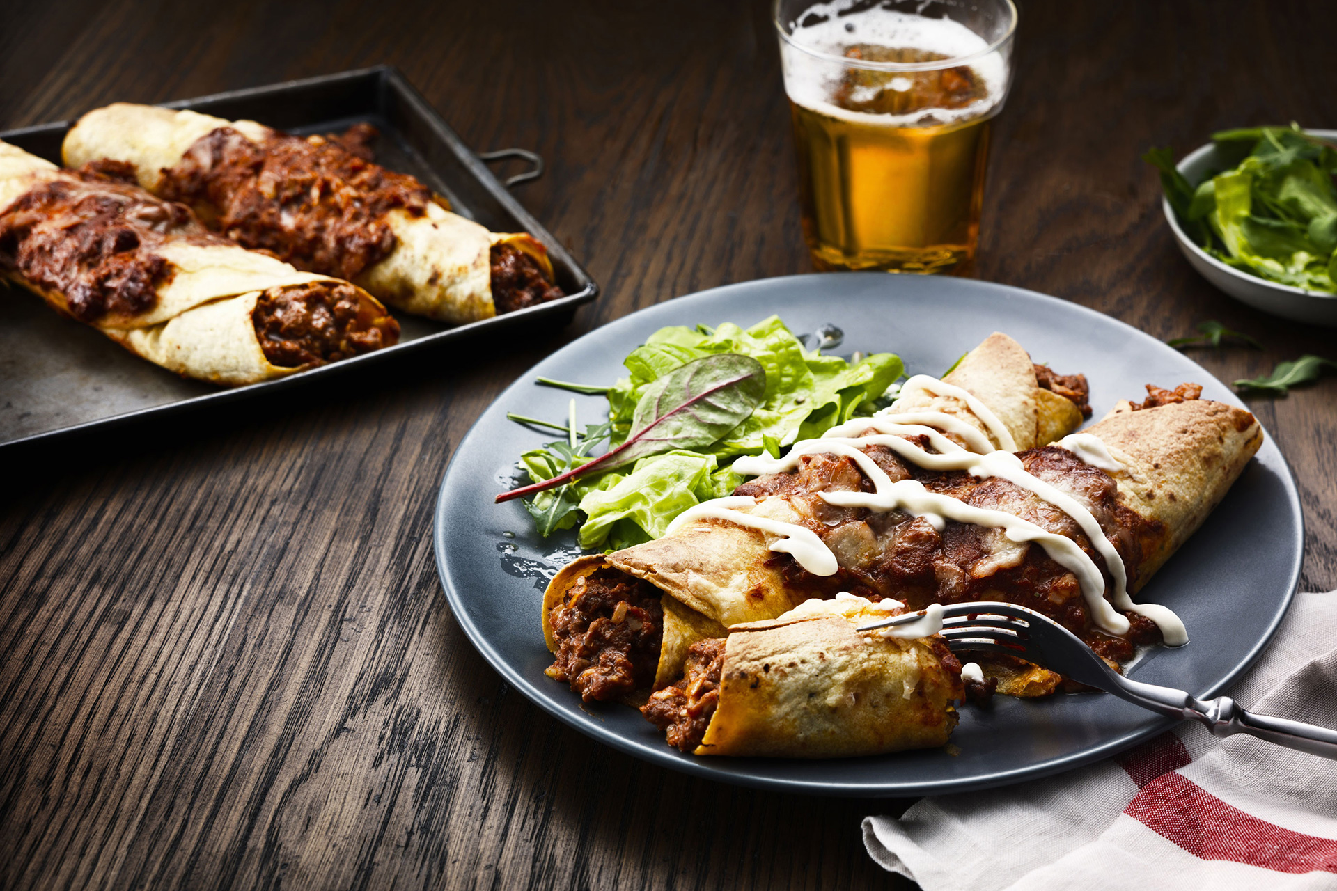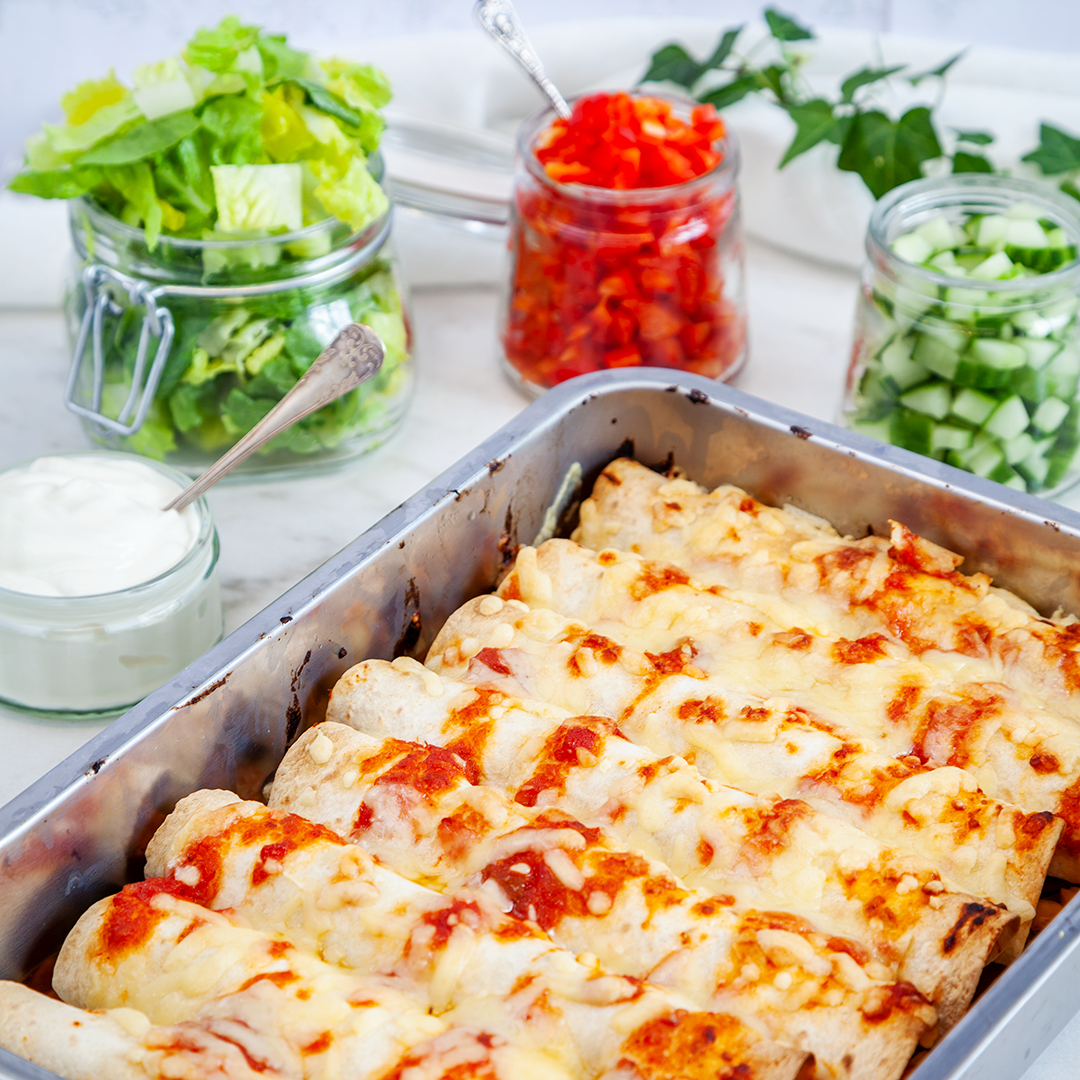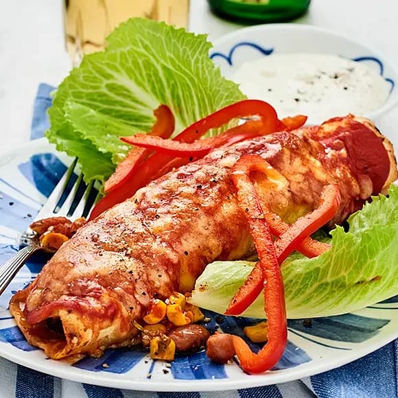 Kryddiga enchiladas med bönchili och tomat- och avokadosallad