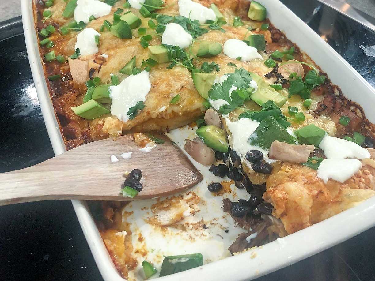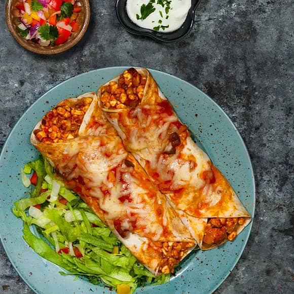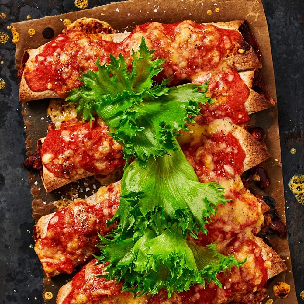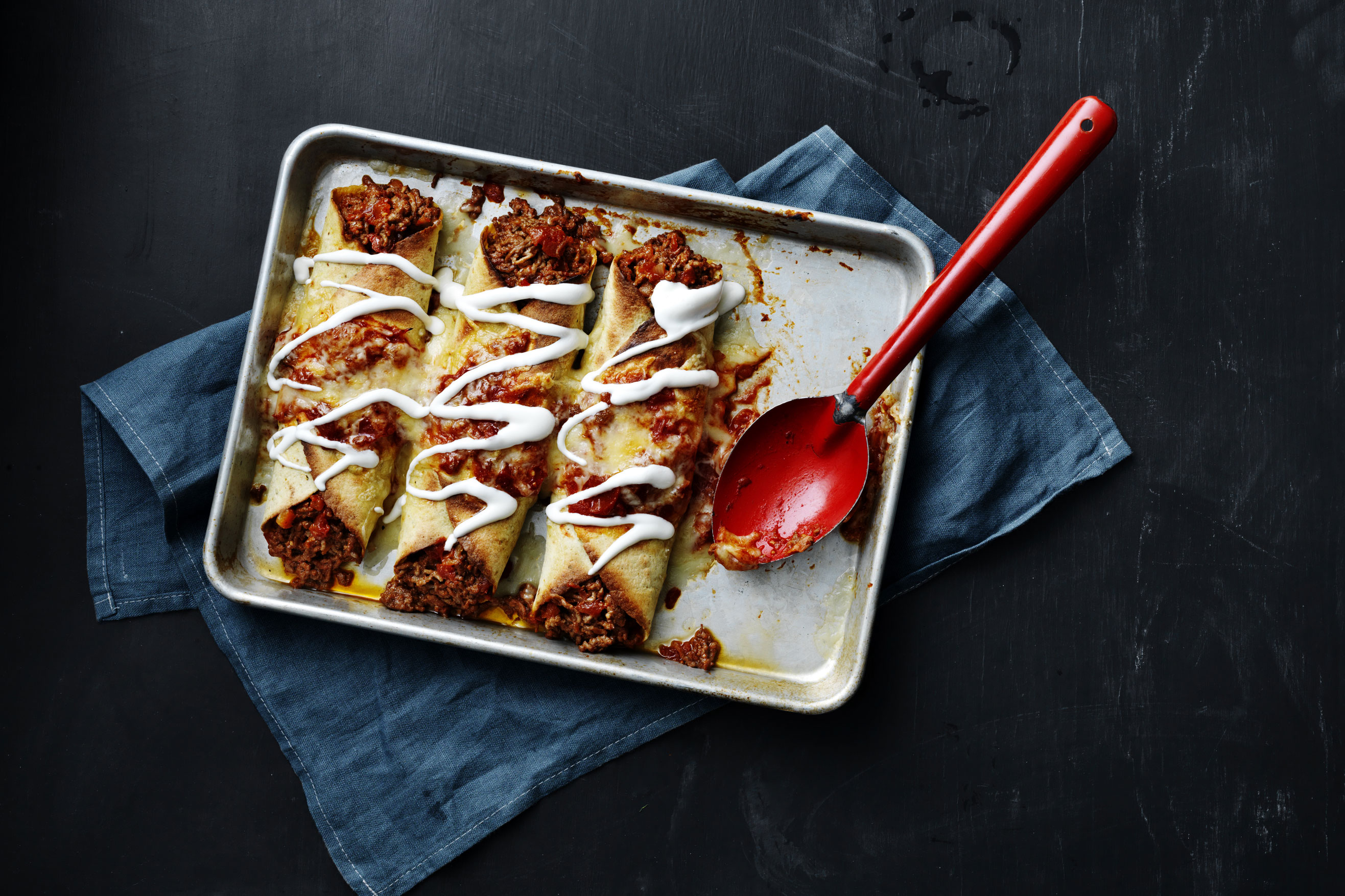 Kryddiga enchiladas med bönchili och tomat- och avokadosallad
