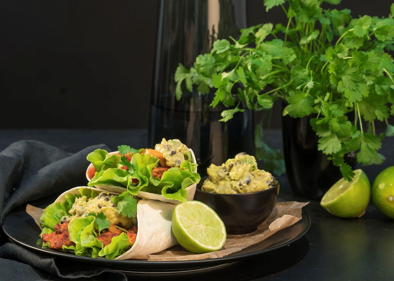 Fajitas med rostade grönsaker, svarta bönor och guacamole