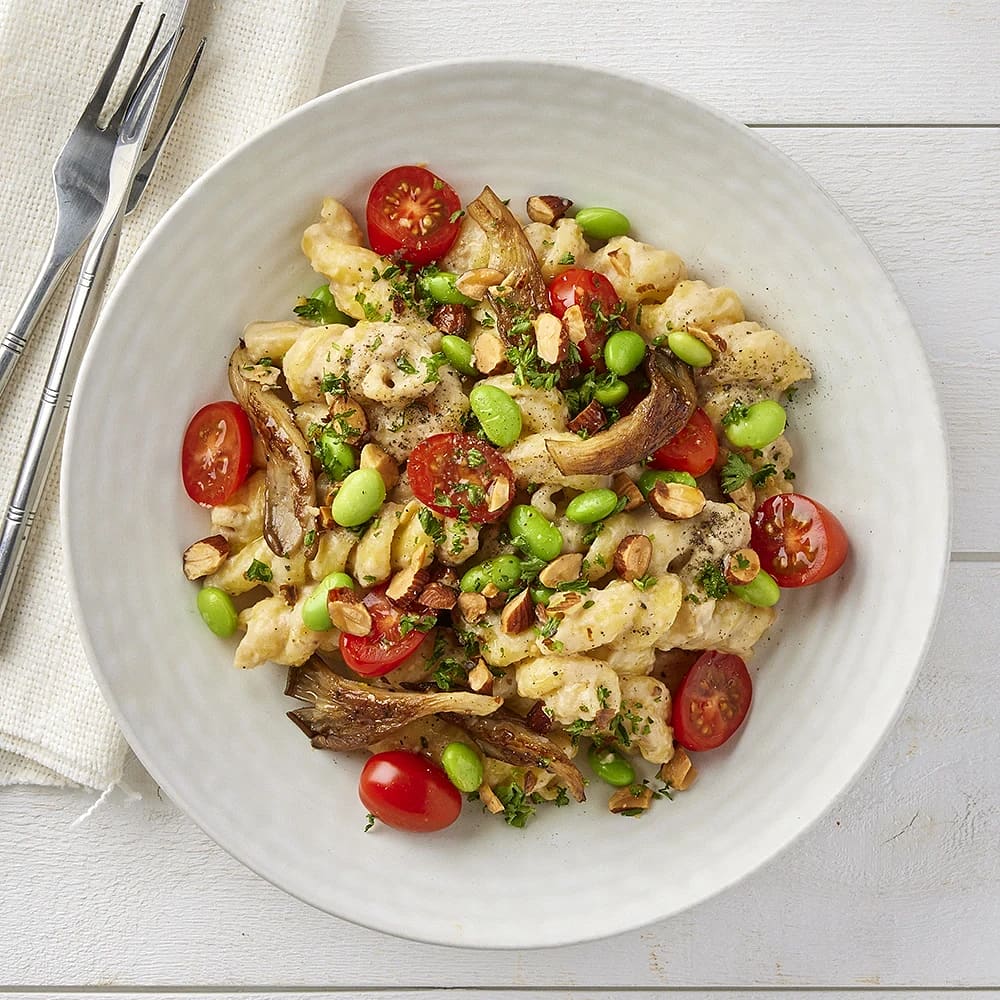 Färsk pasta med inlagda kronärtkockor och riven jordlagrad pecorino ost