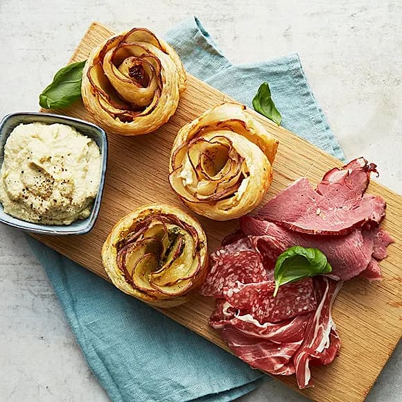 Smördegsflarn med kabanoss, kronärtsskockor, färskost och pumpakärnor