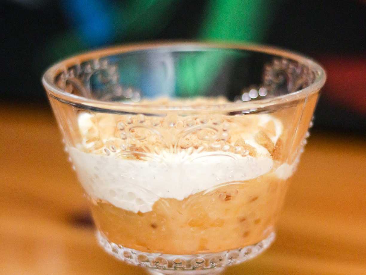 Karamellkokta päron med vispad färskost och krispiga jordärtskockor