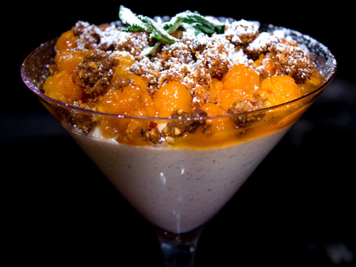 Färskostmousse med bär, basilika, kardemumma och kaksmulor