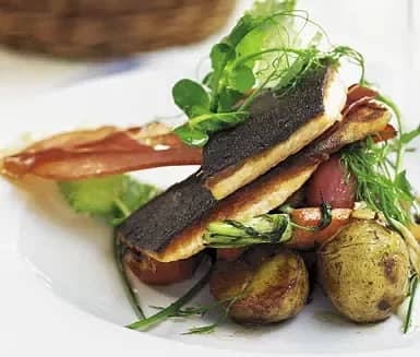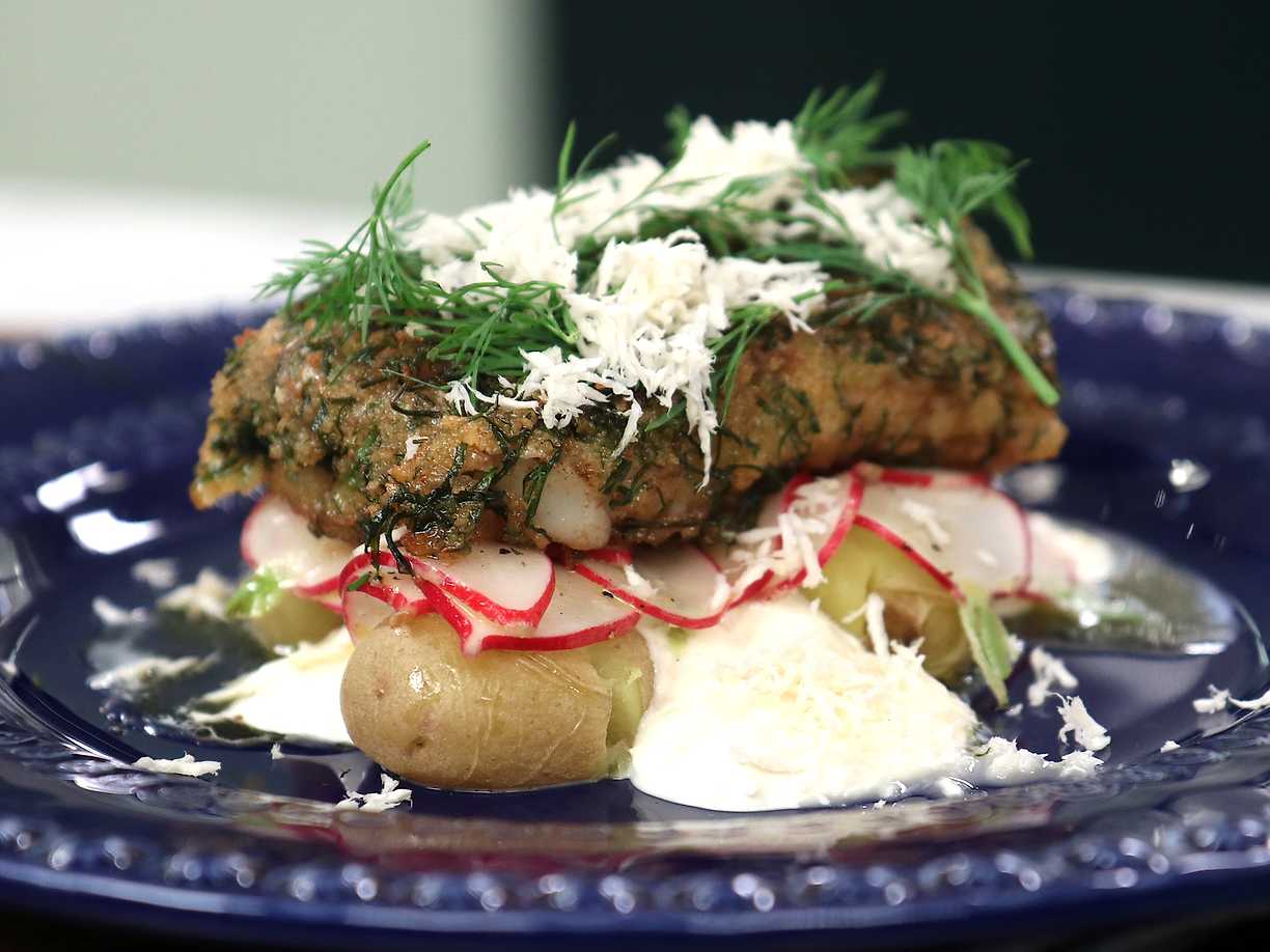Örtpanerad torsk med färskpotatis och pepparrotskräm