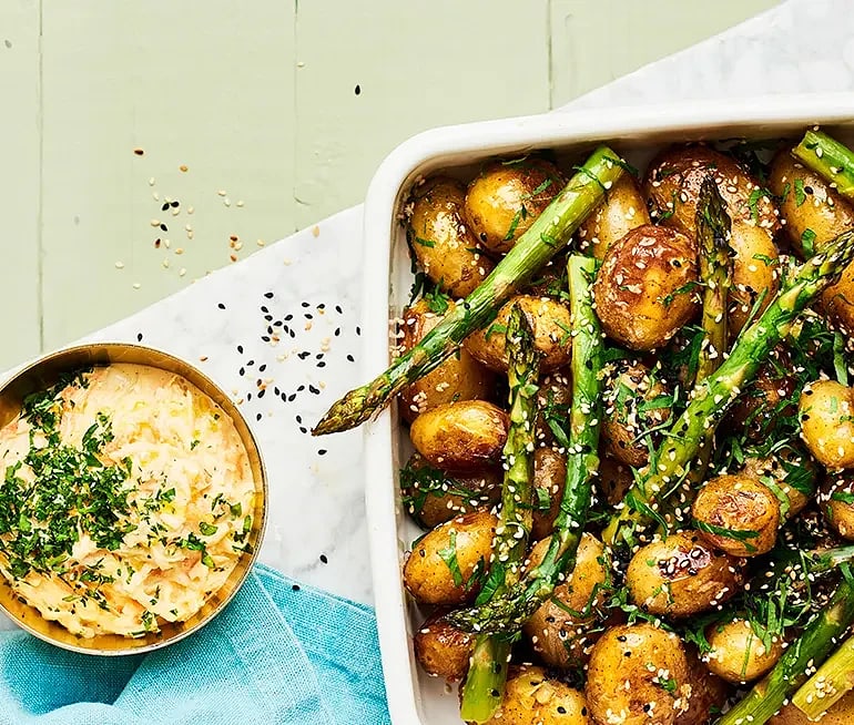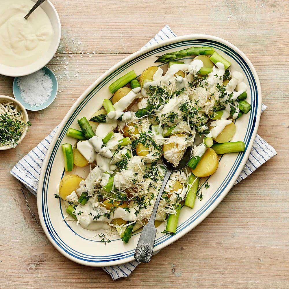 Ugnsrostad färskpotatis och sparris med slaw på majrova