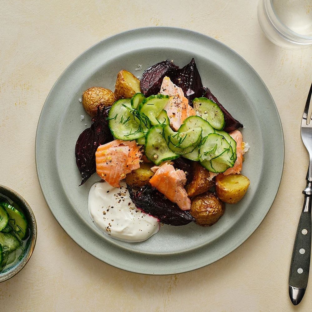 Lax med rostad färskpotatis, rödbetor och picklad gurka