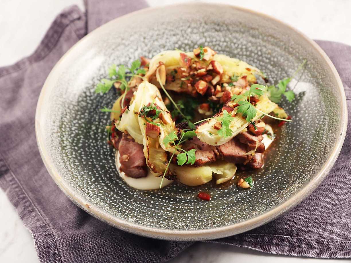 Chilistekt fläskkarré med mjukbakad spetskål och mosad färskpotatis