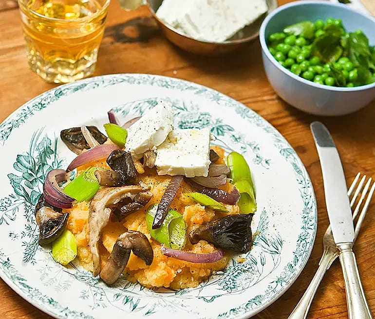 Rostad sötpotatis med fetaost, citron och persilja med vitlöksstekt portabellosvamp