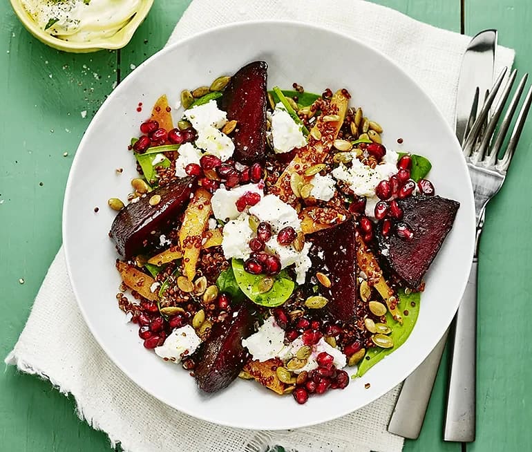 Rödbets- och quinoasallad med granatäpple och fetaost