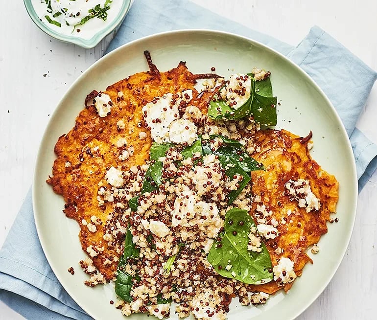 Rostad sötpotatis med portabellosvamp, granatäpple och fetaost