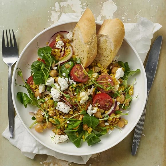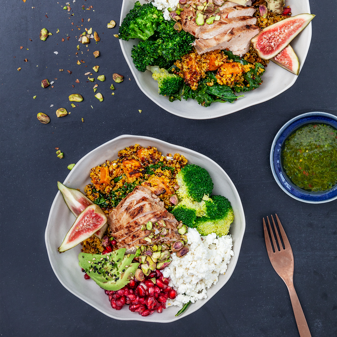 Bowl med saffransquinoa, kyckling, fetaost och granatäpple