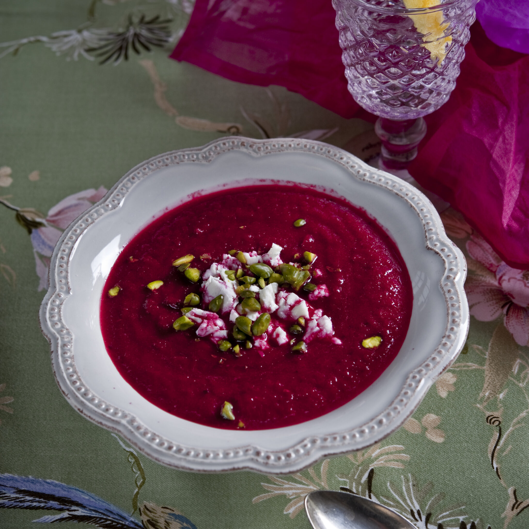 Rostad rödbetsoppa med fetaost och pistaschnötter