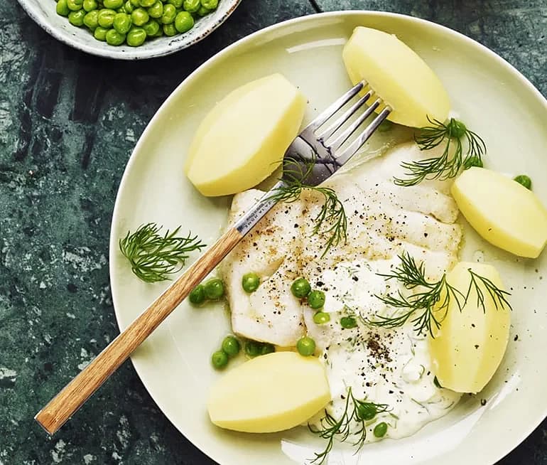 Fisk i mild gräddsås med kokt potatis och ärtor